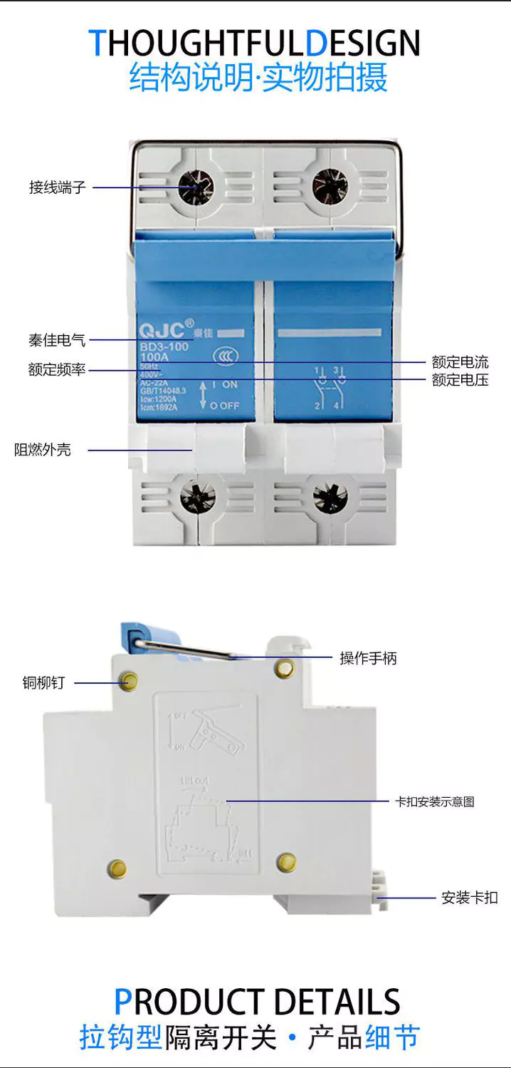 秦佳光伏太阳能BD3-100拉钩隔离开关闸刀式配并网箱小型断路器